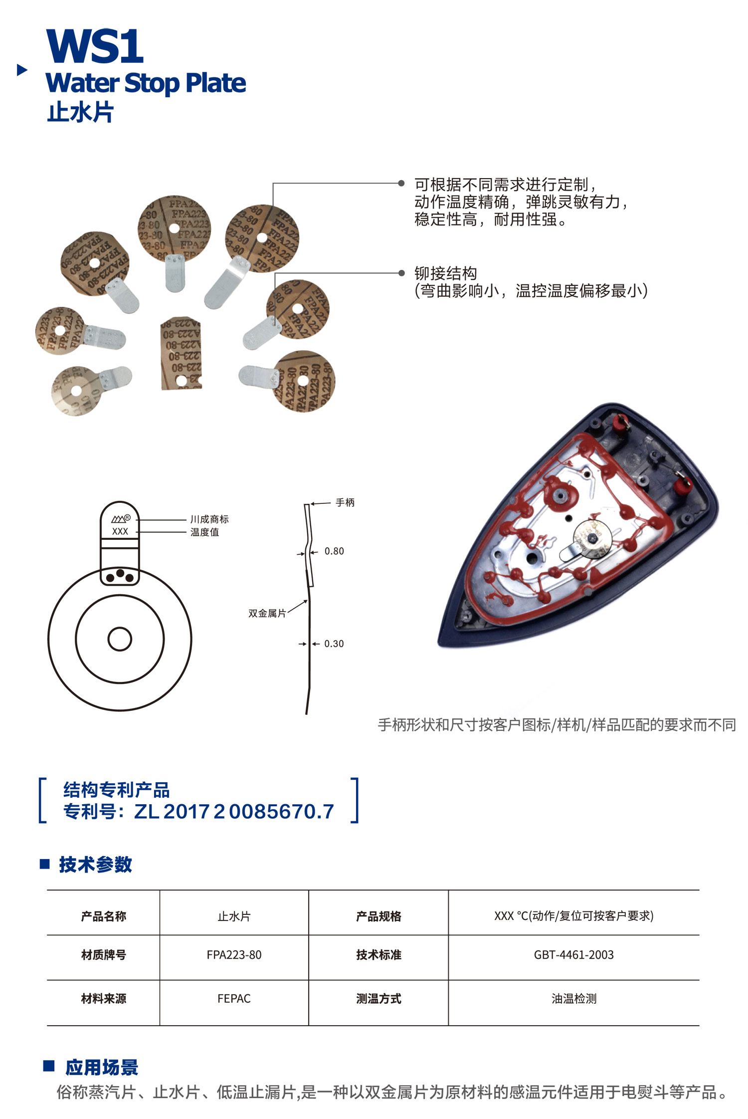 俗称蒸汽片、止水片、低温止漏片,是一种以双金属片为原材料的感温元件适用于电熨斗等产品。